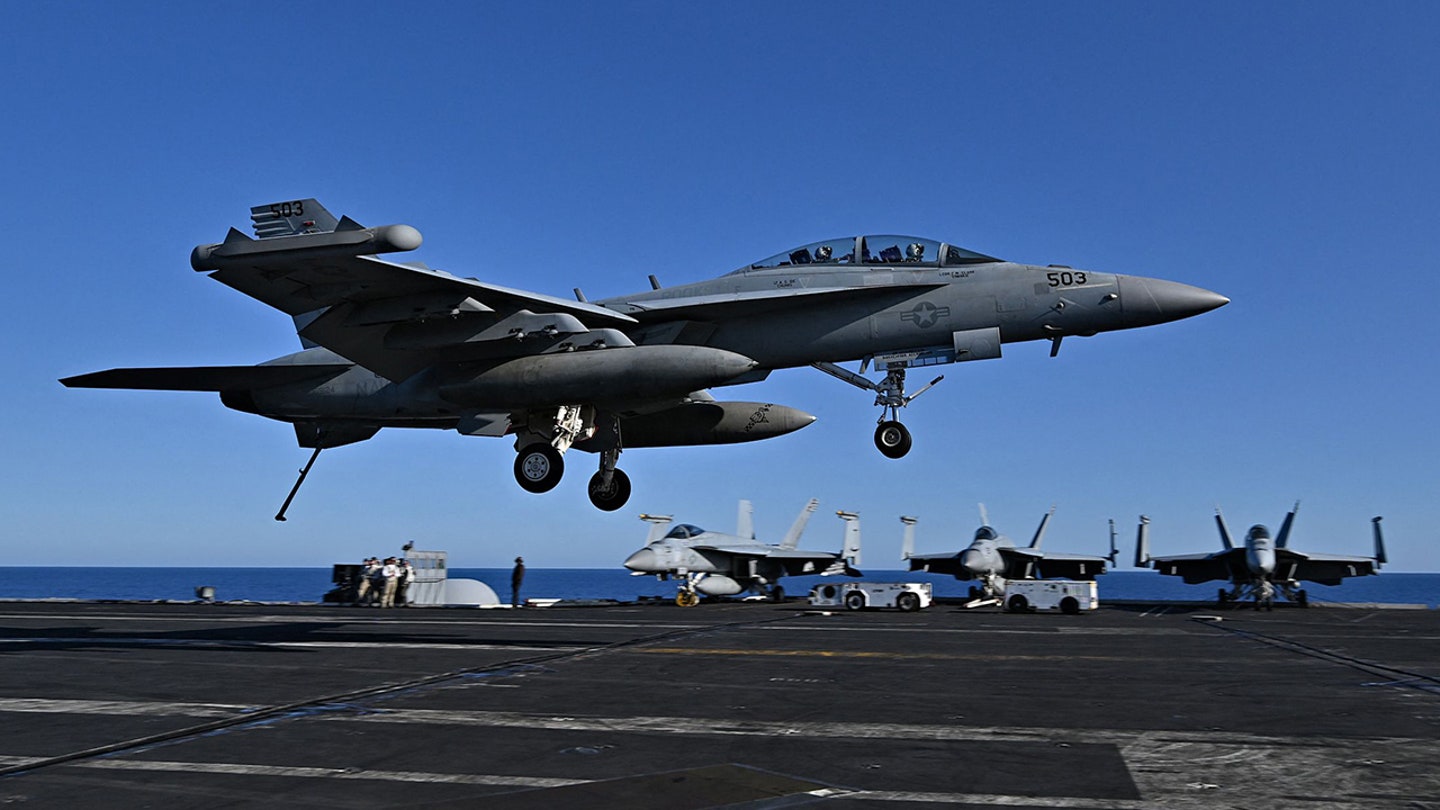 A Navy F/A-18 Super Hornet landing on a carrier. (Kittie Vandenbosch-us Navy/Getty Images)