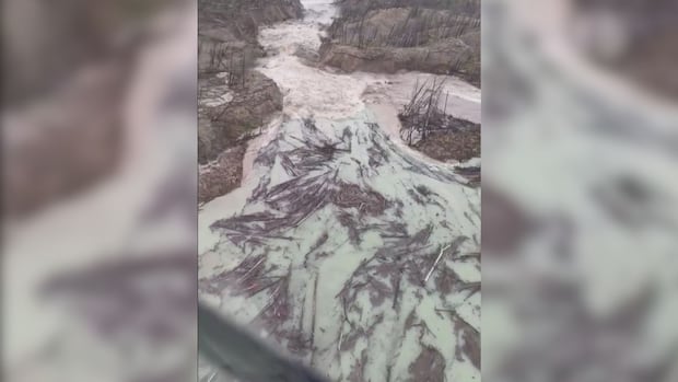 At a news conference Monday afternoon, Connie Chapman with B.C.’s Ministry of Water, Land and Resource Stewardship said the water had since created a 15-metre-wide channel in the dam and was breaching it at a “moderate pace.” She added the dam is carrying wood debris downstream.